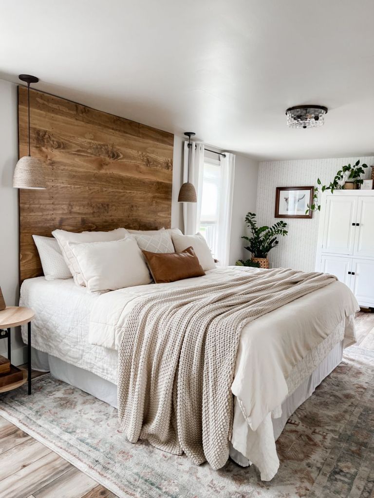 The foundation of this bedroom’s charm lies in its use of soft, earthy hues. The plush white bedding, beige throw blanket, and muted accent pillow create a soothing palette that enhances the tranquility of the space. The rustic wooden headboard serves as a focal point, adding depth and character while bringing warmth to the room.